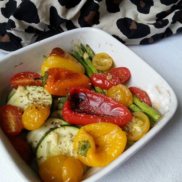 - Das Gemüse in eine Auflaufform geben und mit dem Olivenöl beträufeln und nach Belieben würzen.
