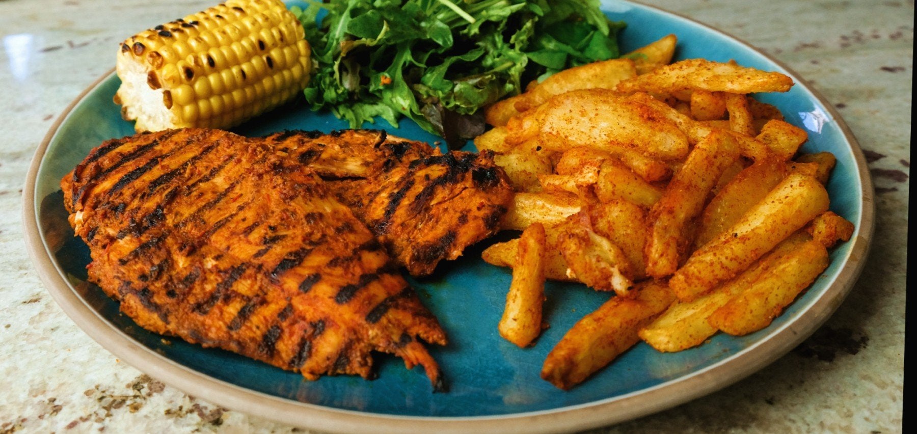 - Serviere das Peri-Peri Chicken und die Peri-Peri-Kartoffel-Chips mit einer Beilage deiner Wahl (Niall hat sich für Maiskolben und Beilagensalat entschieden). Guten Appetit.
