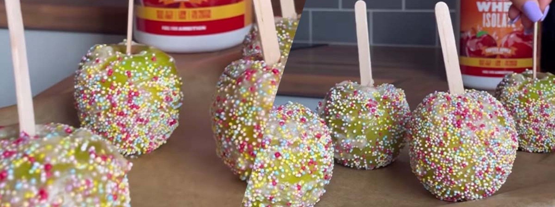 Tauche die Äpfel in die Toffee-Apfel-Mischung, so dass sie vollständig bedeckt sind, und bedecke sie dann mit Streuseln.