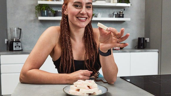 - Streiche die Mischung in einem Silikon-Kuchenform, presse alles gut auf dem Boden der Form und stelle diese für etwa 1 Stunde in den Gefrierschrank.
