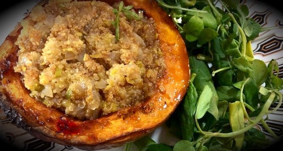 - Verrühre Zwiebel, Lauch und Quinoa, bis du eine homogene Masse hast. Hole den Kürbis aus dem Ofen und gib das Quinoagemisch hinein.