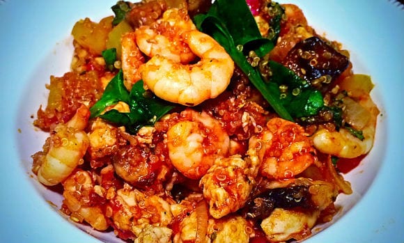 - Gibt dem Pfanneninhalt weitere 7-10 Minuten und füge dann die Tomaten, das Püree und die Garnelen hinzu. Die Garnelen sollten zirka 2 Minuten brauchen, ehe sie einen pinken Farbton annehmen.