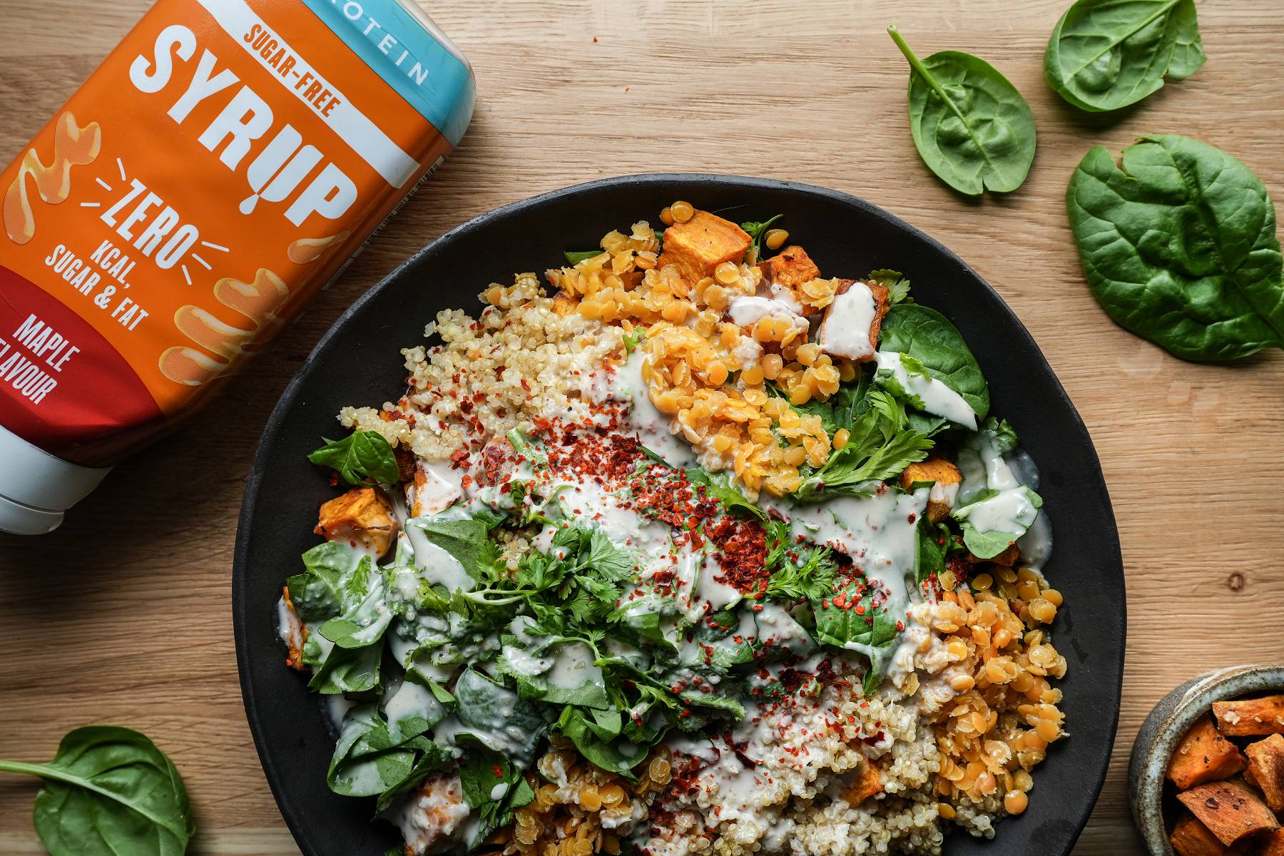 Gib die Linsen, den Quinoa, den Spinat und Koriander in eine Schüssel und vermenge das Ganze mit dem Tahin-Limetten-Dressing. Zum Garnieren eignet sich Sesam. Guten Appetit!