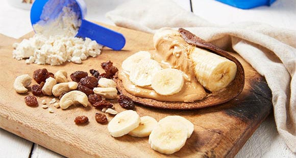 - Gib den Instant Hafer, das Whey, die Rosinen und das restliche Wasser + 50ml Milch in den Mixer.