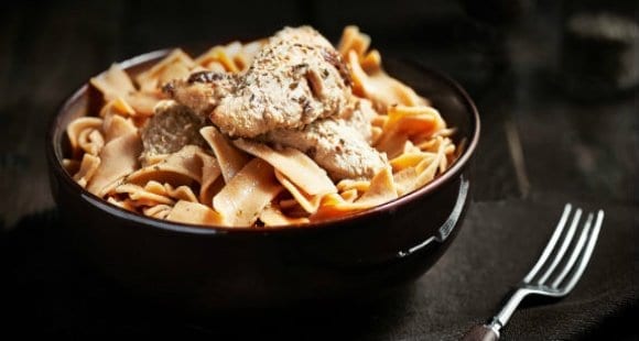 - Gib das Hähnchen anschließend in eine Schüssel, füge die Pasta hinzu und löse den Brühwürfel im verbliebenen Pasta-Kochwasser auf. Mische das Ganze mit dem Bratensaft zu einer leckeren Sauce.