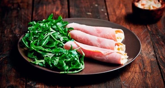 - Roll das Ganze zusammen (und wiederhole es mit den restlichen Schinkenscheiben).