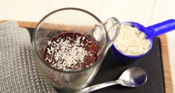 - Gieße den geschmolzenen Kakao über den Protein Tassenkuchen und garniere das Ganze mit ein paar Kokosraspeln.