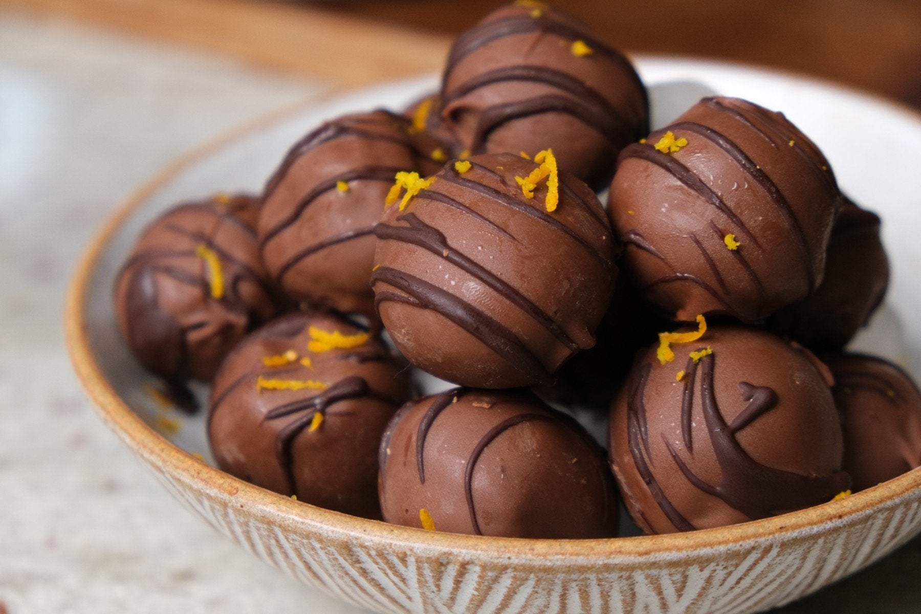 In der Zwischenzeit schmilzt du die Orangen-Schokolade in 30-Sekunden-Intervallen in der Mikrowelle, wobei du nach jedem Intervall umrühren solltest. Nimm die Energiekugeln aus dem Kühlschrank, sobald sie abgekühlt sind, und tauche sie mit einem Spieß oder Zahnstocher in die geschmolzene Orangen-Schokolade, bis sie vollständig bedeckt sind.