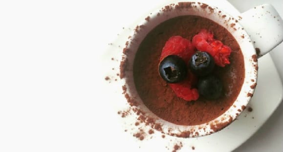 - Serviere das Mousse mit frischem Beerenobst und streue noch etwas Kakaopulver oben drauf. Optional kannst du auch mit Kokosstückchen oder –raspeln garnieren.
