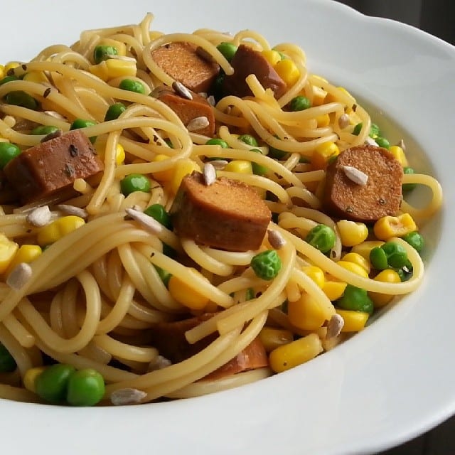 - Die (Tofu) Wurst in Scheiben schneiden und mit den restlichen Zutaten unter die Nudeln mischen.