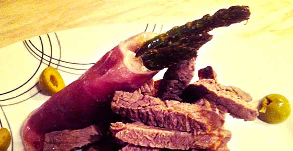 Steak-Streifen mit Spargelpäckchen in Parmaschinken