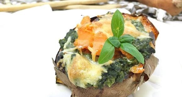 Du liebst Süßkartoffel, aber dir fehlen manchmal gute Rezepte und Inspirationen? Wir haben hier ein super leckeres, gesundes und satt machendes Süßkartoffel-Rezept: Überbackene Kartoffel mit Spinat, verfeinert mit mildem Frischkäse, überbacken mit Käse- ein Hochgenuss!
