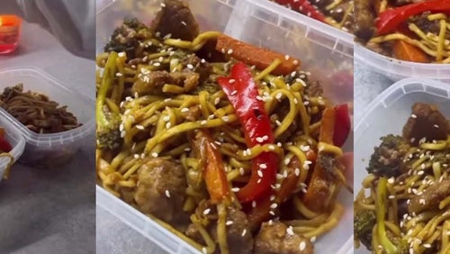 Gib das Fleisch auf eine Seite deines proteinreichen Wraps, gefolgt von einem großzügigen Spritzer Sweet Chili Sauce und geraspeltem Käse.