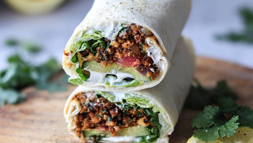 Lass dich vom Namen nicht täuschen – diese Tofu-Hack Wraps sind zu 100% vegan und damit bestens für deine rein pflanzliche Meal-Prep (oder fleischfreie Alternative zur Abwechslung) geeignet.