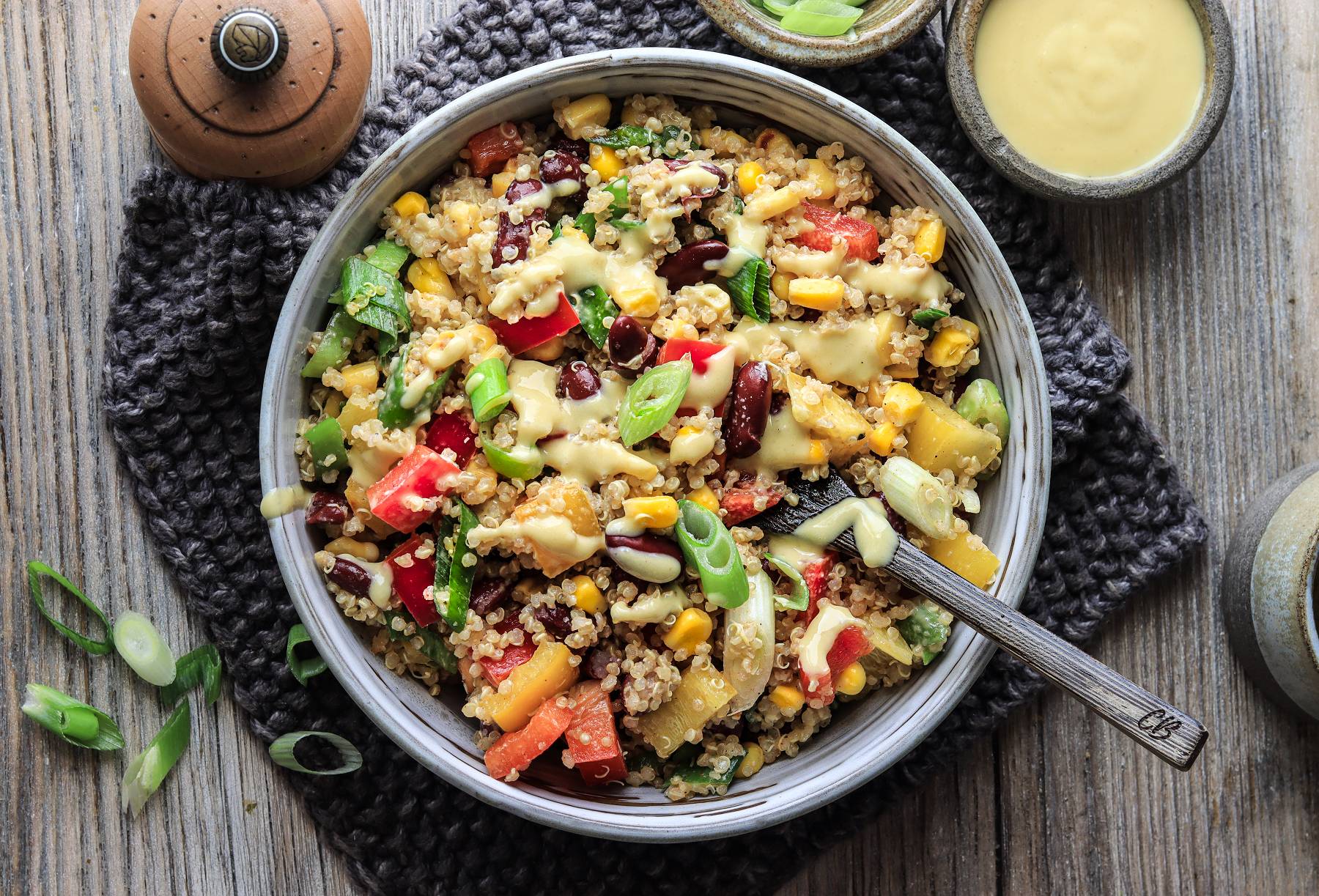 In einer Salatschüssel vermengst du den Quinoa mit den restlichen Zutaten und servierst ihn mit dem Tahin Dressing. Fertig!