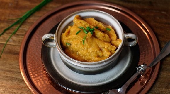 - Die fertigen Süßkartoffeln abgießen, gut abtropfen lassen und dann mit einem Mixer oder Pürierstab vermatschen.