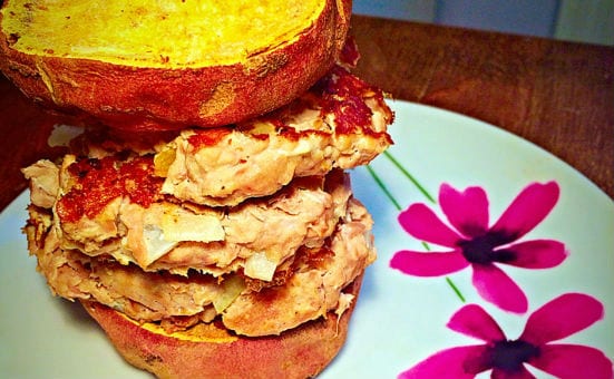 - Hole die Süßkartoffel nach Ablauf der 40 Minuten aus dem Ofen heraus und fange damit an dir den ultimativen Thunfisch-Burger zu basteln. Natürlich kannst du hierfür auch Salat- und Spinatblätter, Gurken, Tomaten und alles, was dein Herz begehrt, nehmen.