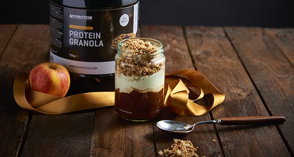 - Sobald das Apfelmus abgekühlt ist, kannst du dein Glas füllen: Als Basis gibst du 2 Esslöffel Apfelmus ins Glas. Darauf kommen 3 Esslöffel Joghurt. Und als Topping nimmst du 3 Esslöffel unseres Protein-Müslis.