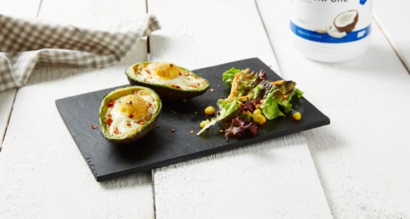 - Mache die Eier in die Höhlen der Avocado und würze mit Chilli, Salz und Pfeffer.