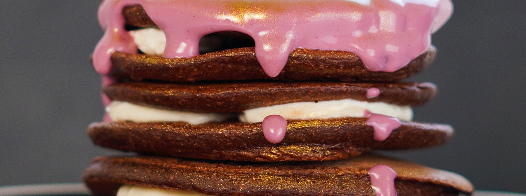 Baue nun dein Pancake-Stack auf, indem du die Pfannkuchen aufeinander stapelst und zwischen jeden Pfannkuchen etwas von der weißen Glasur hinzugibst. Ganz zum Schluss kommt die lila Glasur obendrauf.