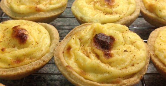 - Hole die Pasteten aus dem Ofen und gieße vorsichtig die Vanille-Creme hinein und streu das restliche Muskatnusspulver drüber.