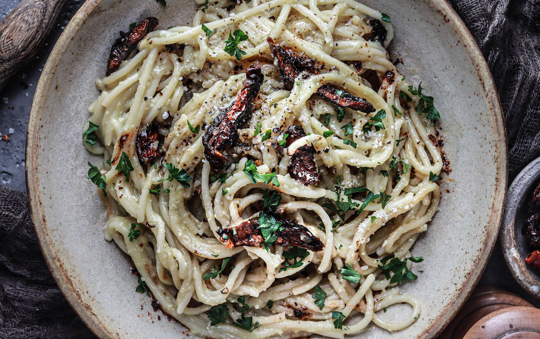 Gib die Soße in eine tiefe Pfanne und koch sie kurz auf. Heb die Pasta unter und serviere alles mit dem Tomaten Speck.