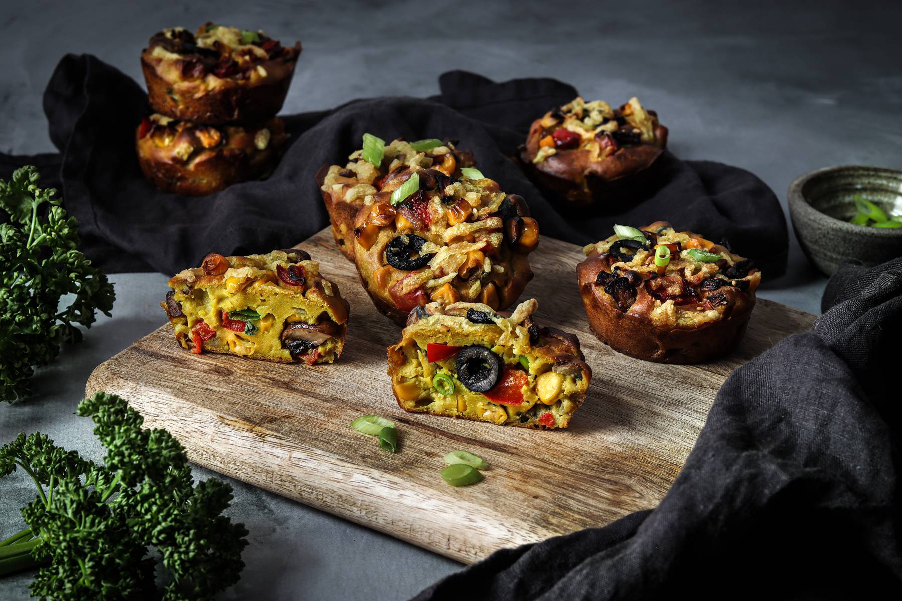 Nun verteilst du die Masse in einer Muffinform. Dekoriere die Muffins mit etwas Streukäse und dem Gemüse, welches du beiseite gestellt hast.