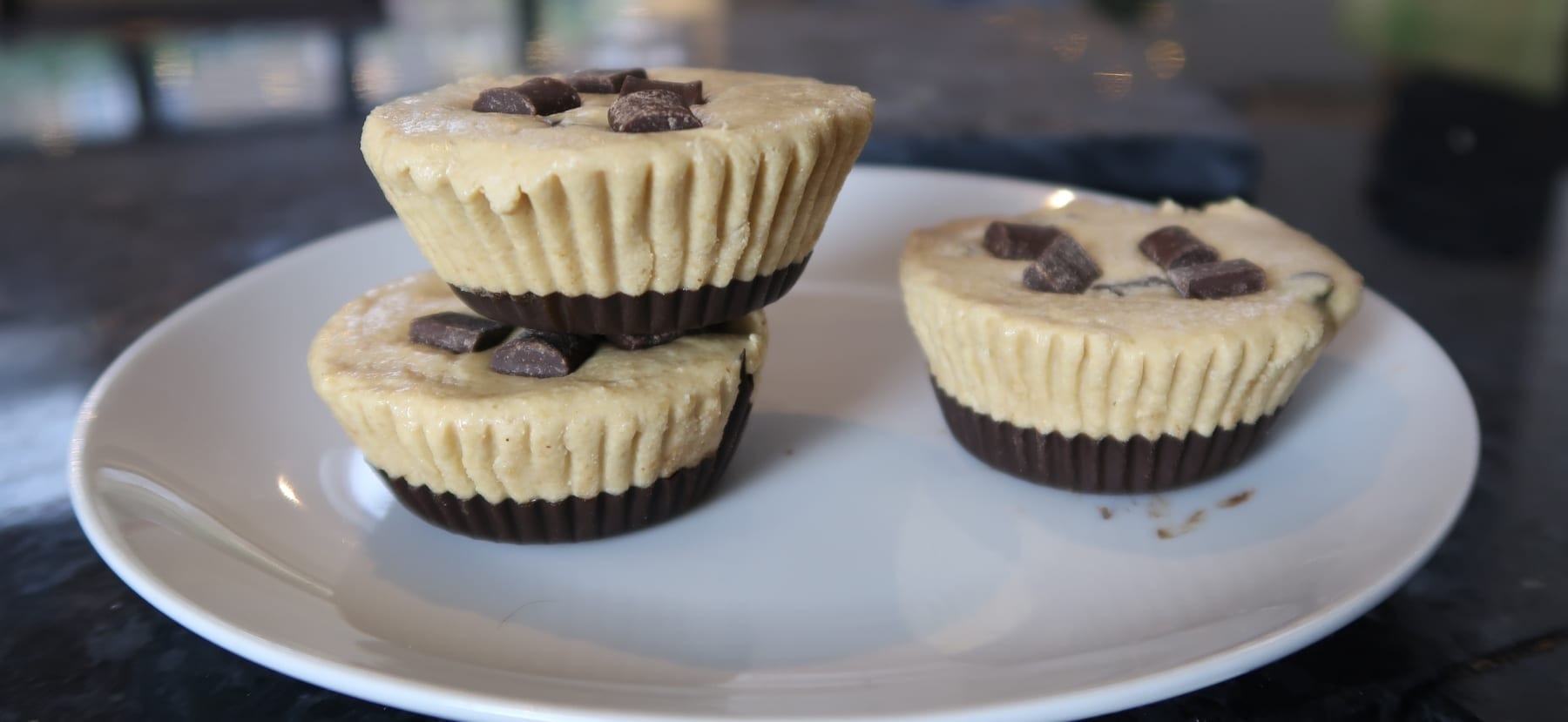 Dekoriere deine veganen Cookie Dough Cups mit dunklen Schokostückchen und stelle sie für 30 Minuten zum Abkühlen in den Kühlschrank.