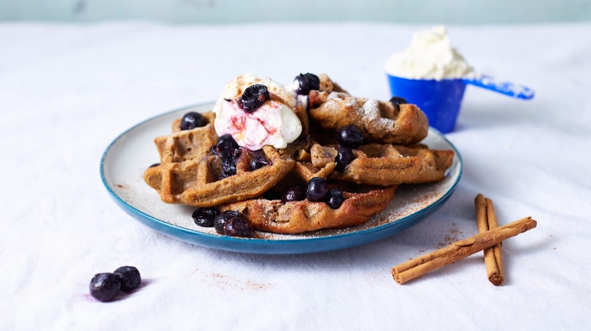 Falls du ein Waffeleisen benutzt: heize das Waffeleisen für einen kurzen Moment vor und streiche es mit veganem Öl aus. Backe dann die Waffeln je nach Instruktionen deines Waffeleisens. Falls du eine Silikonform benutzt: Heize den Ofen bei 220°C oder 200°C Umluft vor. Gieße den Teig in die Form und beschwere sie mit einem Backblech, damit die Waffeln nicht zu sehr aufgehen. Backe sie für 9-10 Minuten oder bis sie Goldbraun sind.