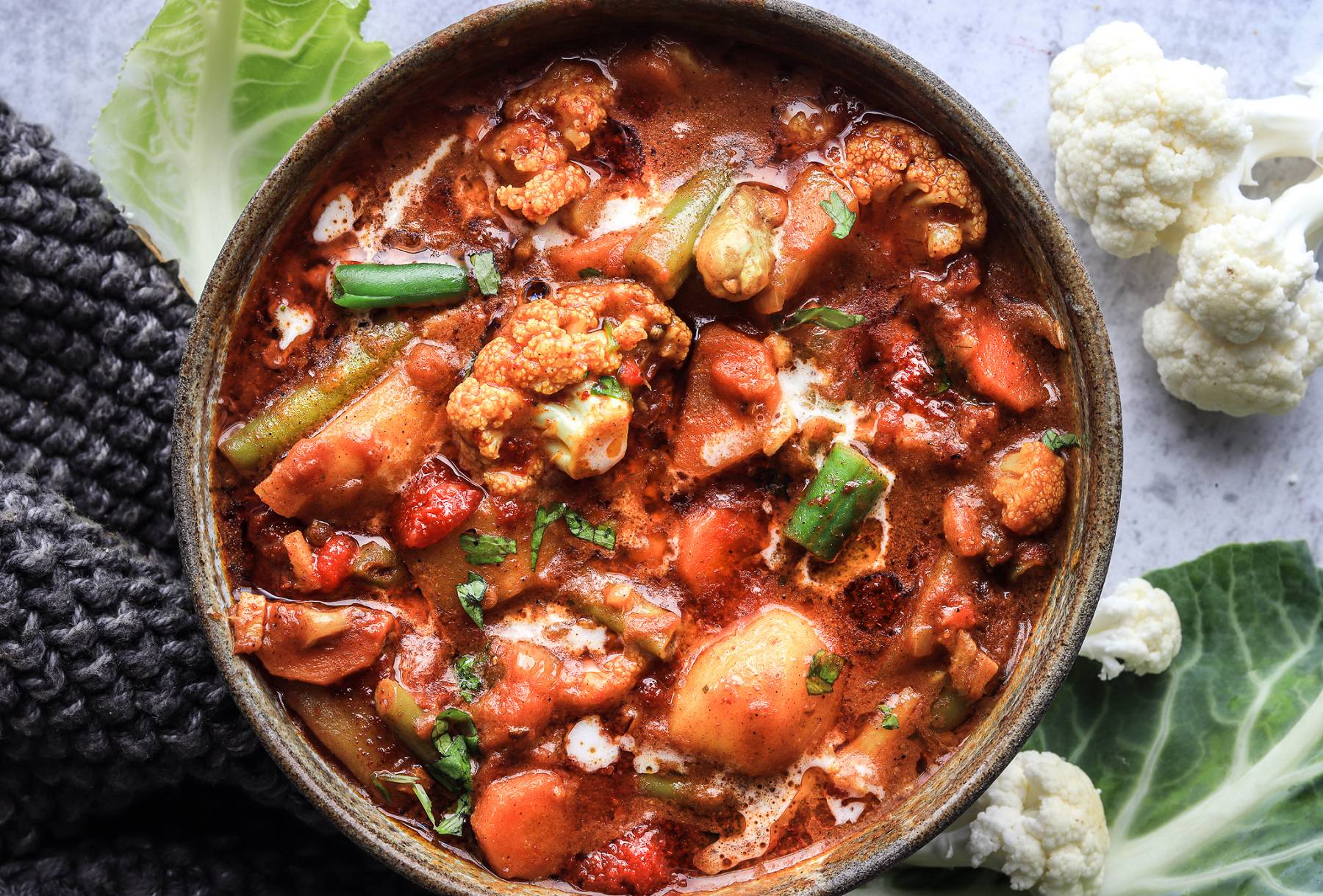 Gib die Kartoffeln, Blumenkohl Röschen, Karotten, TK Bohnen hinzu und brate alles 3 weitere Minuten an.