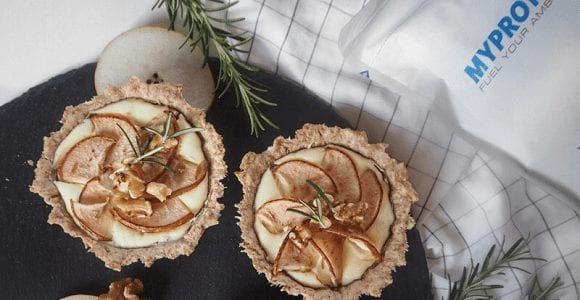 - Wenn die Böden für die Tartlettes fertig sind, holst du sie aus dem Ofen und verteilst die Käsemasse darauf. Dann kommen die Birnenscheiben dazu.