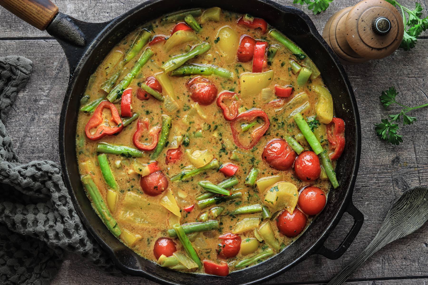 Gieße die Brühe auf. Gib die Gewürze und den Humus hinzu und koche alles auf.