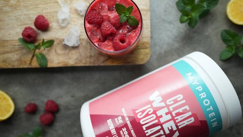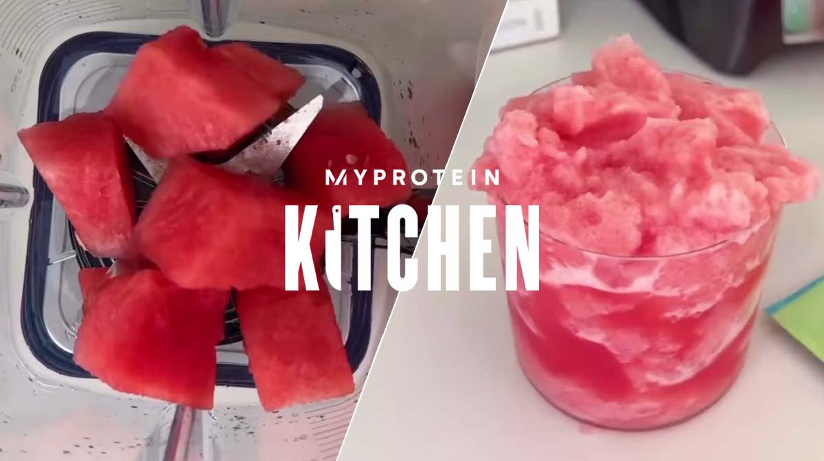 Gib die (gefrorene) Wassermelone zum Clear Whey Protein in einen Mixer. Falls die Melone nicht gefroren sein sollte, empfiehlt Miranda die Hinzugabe von ein paar Eiswürfeln, um einen eiskalten Slushie zuzubereiten.