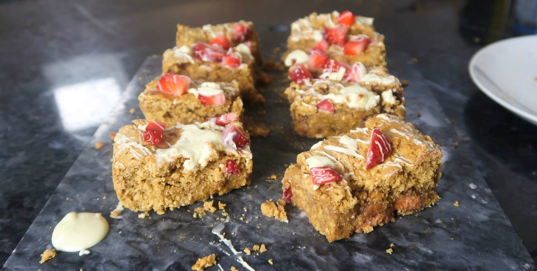 Dekoriert mit frischen Erdbeeren und geschmolzener weißer Schokolade, sind diese frisch gebackenen Blondies beinahe schon zu schade, um sie zu essen! Die Blondies stellen die perfekte Post-Workout Belohnung dar und können innerhalb weniger Minuten zubereitet werden.