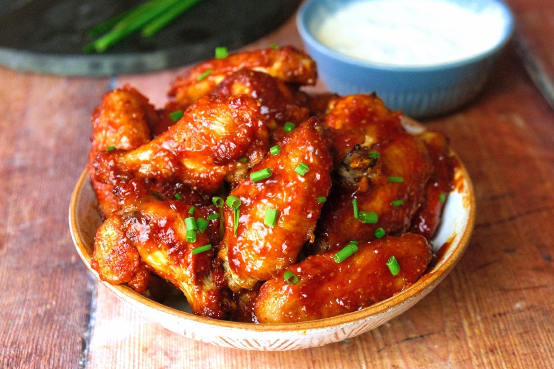 In der Zwischenzeit die Zutaten für die Honig-BBQ-Sauce verrühren, bis sie vollständig vermischt sind. Sobald die Wings gebacken sind, aus dem Ofen nehmen und mit der Honig-BBQ-Sauce beträufeln. Mit einer Zange die Flügel umdrehen, um sie mit der Sauce zu überziehen. Wenn sie vollständig überzogen sind, noch 5 Minuten backen und dann herausnehmen.