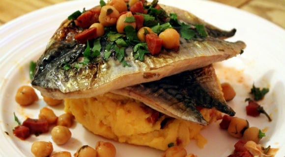 - Während der Fisch brät, gibst du die Kichererbsen in eine Schüssel.