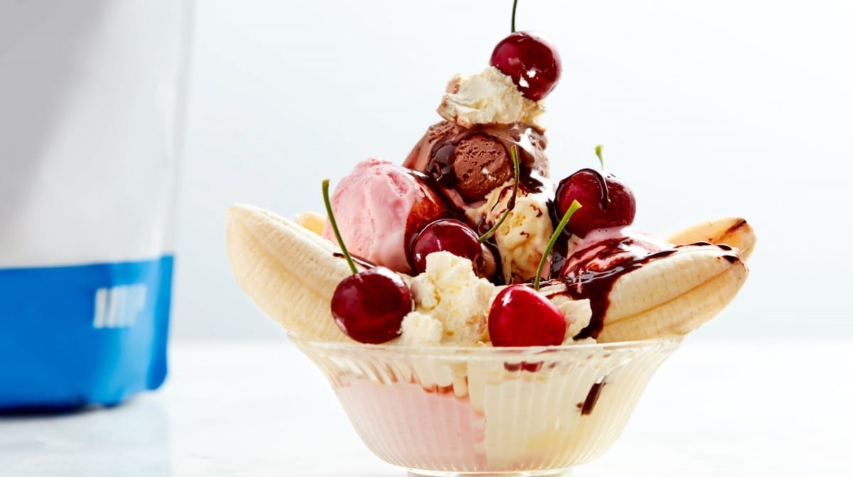 #3 Stelle deinen einzigartigen Split zusammen! Lege dazu die Bananenhälfte in eine Schale, gib drei Kugel Proteineis hinzu, die Kokosmilch (wenn du es besonders ausgefallen magst, kannst du sie draufsprühen), zuckerfreier Sirup, frische Kirschen und bestreusel das Ganze mit den Kakao Nibs.