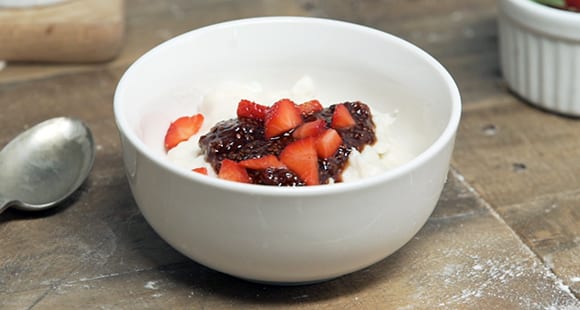- Vermische das Reisprotein-Puddingpulver mit dem Wasser, gib es in die Mikrowelle und erhitze, bis die Masse eindickt. Mit der selbstgemachten Marmelade toppen.