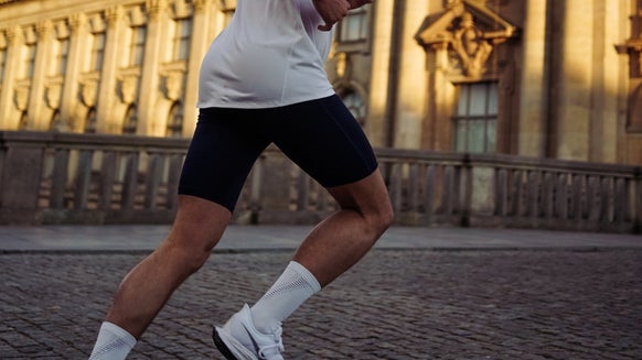 - Während du nun also abwechselnd das linke und rechte Bein zur Brust hochziehst und wieder durchstreckst, bringst du einen „Twist“ in die Übung ein. Versuche mit den Ellbogen die Knie zu berühren, wobei du den rechten Ellbogen zum linken Knie bewegst und den linken Ellbogen zum rechten Knie – immer abwechselnd.