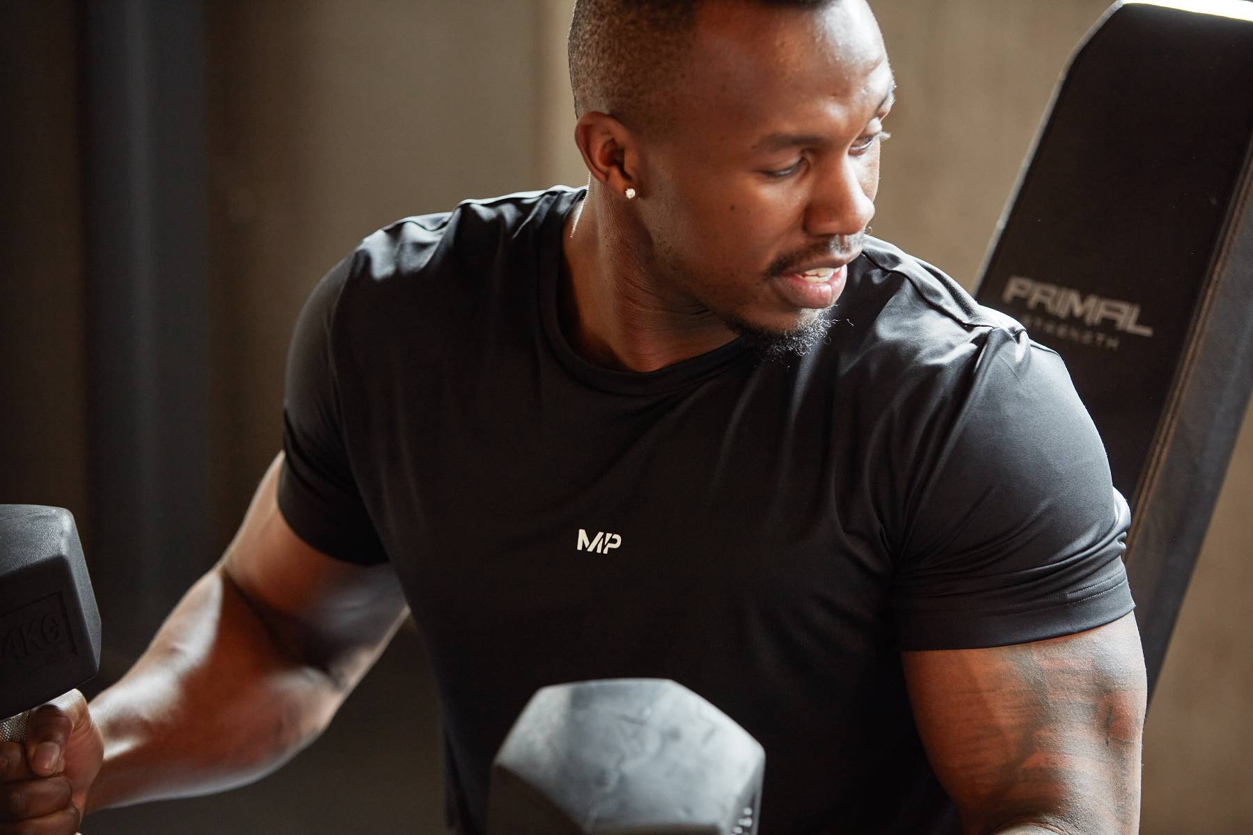 - Die Kurzhanteln dürfen sich am obersten Punkt nicht berühren. Halte die Position für eine Sekunde und wiederhole die Bewegung.