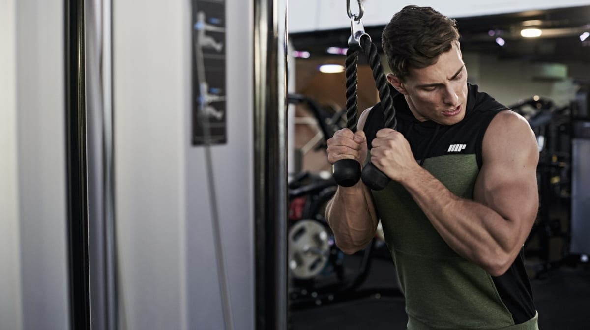 - Strecke dich langsam über die Ellbogen und drücke beide Griffe direkt vor dir zusammen. Achte darauf, dass deine Schulterblätter während der gesamten Bewegung zurückgezogen bleiben.