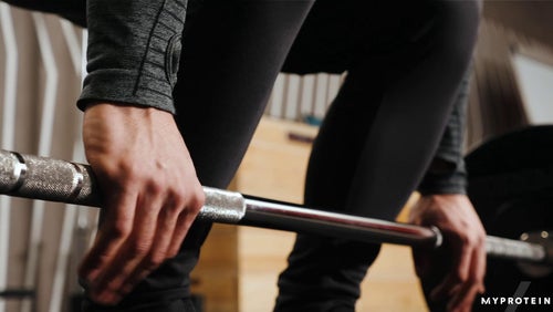 - Beginne mit der Hantel an den Füßen und greife die Stange mit den Händen, die etwas weniger als schulterbreit auseinander sind. Spanne deine Körpermitte an und drücke die Gesäßmuskeln zusammen - so wird das Schwingen minimiert und eine Verletzung deines unteren Rückens vermieden.