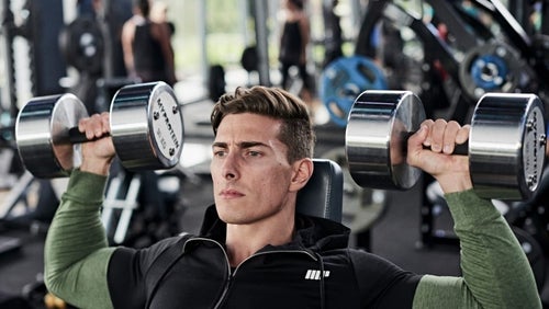 - Begib dich in dieselbe Ausgangsposition wie für das klassische Kurzhantel-Bankdrücken. Drücke anschließend das Gewicht nach oben, sodass deine Handgelenke in einer Linie mit deinen Ellenbogen und Schultern stehen.