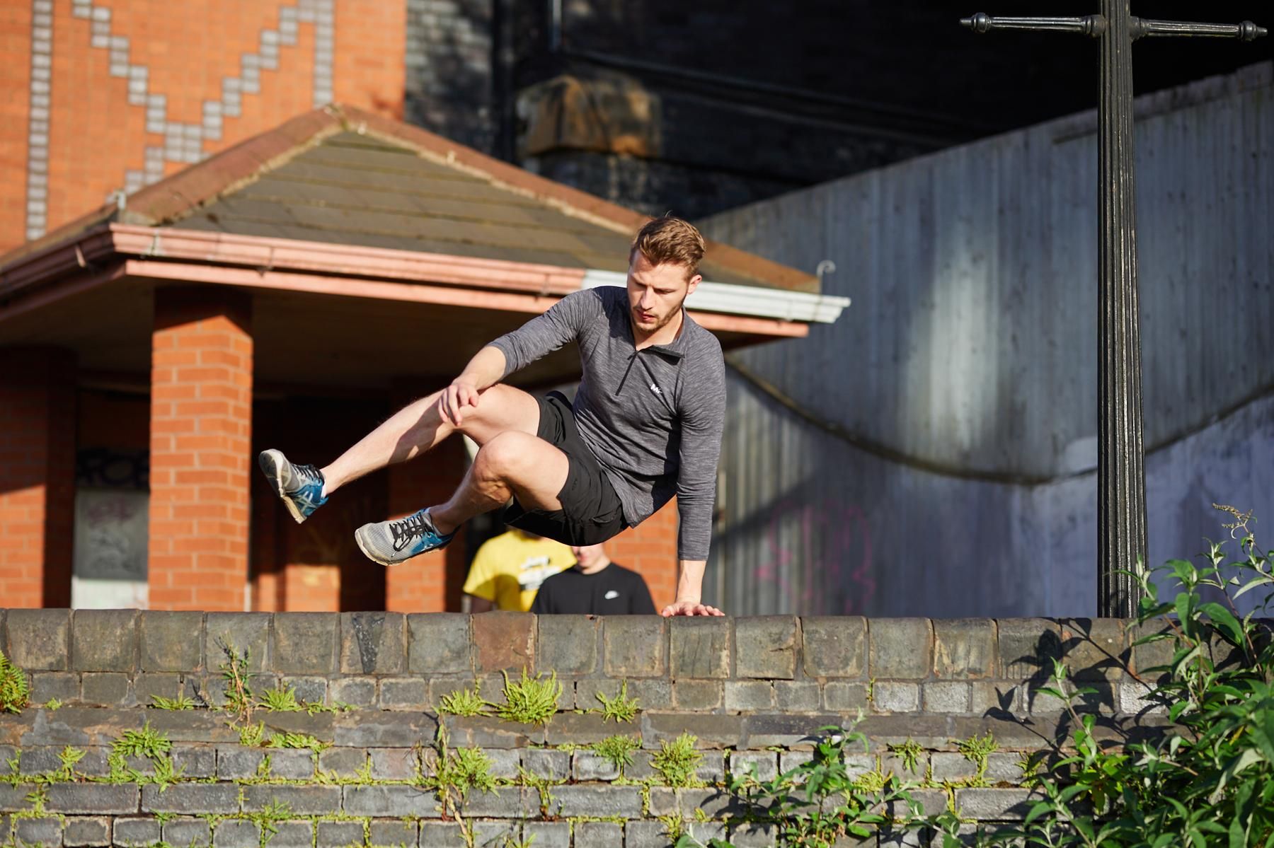 Während er seine Bewegungen mit Adam auf den Straßen von Manchester perfektioniert, bereitet er seinen Körper mit Übungen im Fitnessstudio (auf Mallorca) auf die körperlichen Anforderungen des Parkours vor.