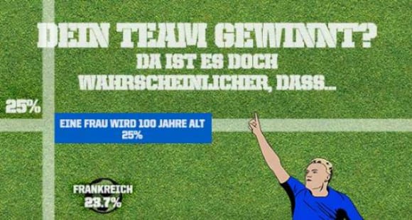 Um dir einen Ausblick darüber zu geben, welche Euro Teams eine Chance auf die Meisterschaft haben, rechneten wir Daten von Betfair in prozentuale Wahrscheinlichkeiten um (zusammen mit ein paar weiteren unwahrscheinlichen Fakten. Der Vergleich dieser Informationen hat zu unterhaltsamen, aber auch nachdenklichen, Entdeckungen geführt. So zum Beispiel die Tatsache, dass die Chance für England auf den Pokal genauso hoch liegt, wie die Wahrscheinlichkeit auf ein Erdbeben in England (10%). Die Chance auf einen Endsieg der französischen Mannschaft liegt zwar recht hoch (23,7%), aber du solltest auch im Hinterkopf behalten, dass du - sofern du weiblich bist - eine höhere Chance hast 100 Jahre alt zu werden - was dir genug Zeit verschafft (25 Europameisterschaften um genau zu sein), um dein Team beim siegen zu sehen.
