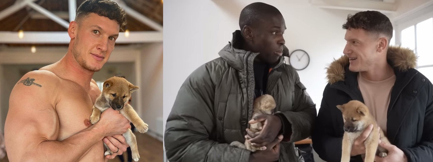 Während sich Matt und Paul in die Kinderpose begaben, kamen ein paar Shiba-Welpen auf sie zu, um ihnen Gesellschaft zu leisten. Sie sprangen um sie herum und boten eine willkommene Ablenkung für die beiden.